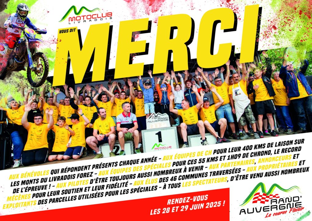 L’ensemble des membres du MC Livradois tiennent à remercier tous les acteurs de cette magnifique édition de la Rand’Auvergne. Commissaires, pilotes, bénévoles, spectateurs, partenaires, officiels, prestataires, élus ou propriétaires, vraiment MERCI pour cette magnifique RAND !!! Rendez vous les 28 et 29 Juin 2025 pour la 34 ème bougie !!!
