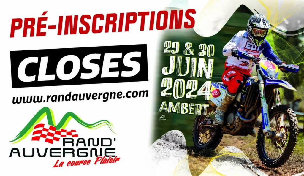Pour vous faciliter les choses, voici le retro planning des pré inscriptions de la Rand’Auvergne 2024 : 13 au 15 Mars réception du mail confirmant votre statuts : RETENU – EN ATTENTE – REFUSE 29 Mars date limite d’envoie du règlement : carte bancaire ou virement (RIB en pj du mail de confirmation) 04 […]