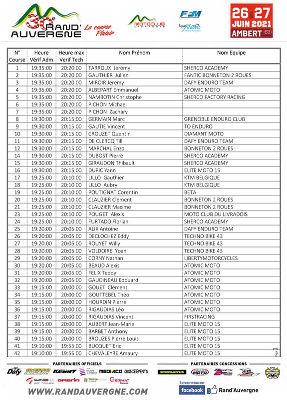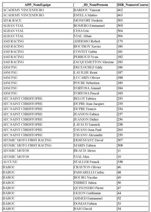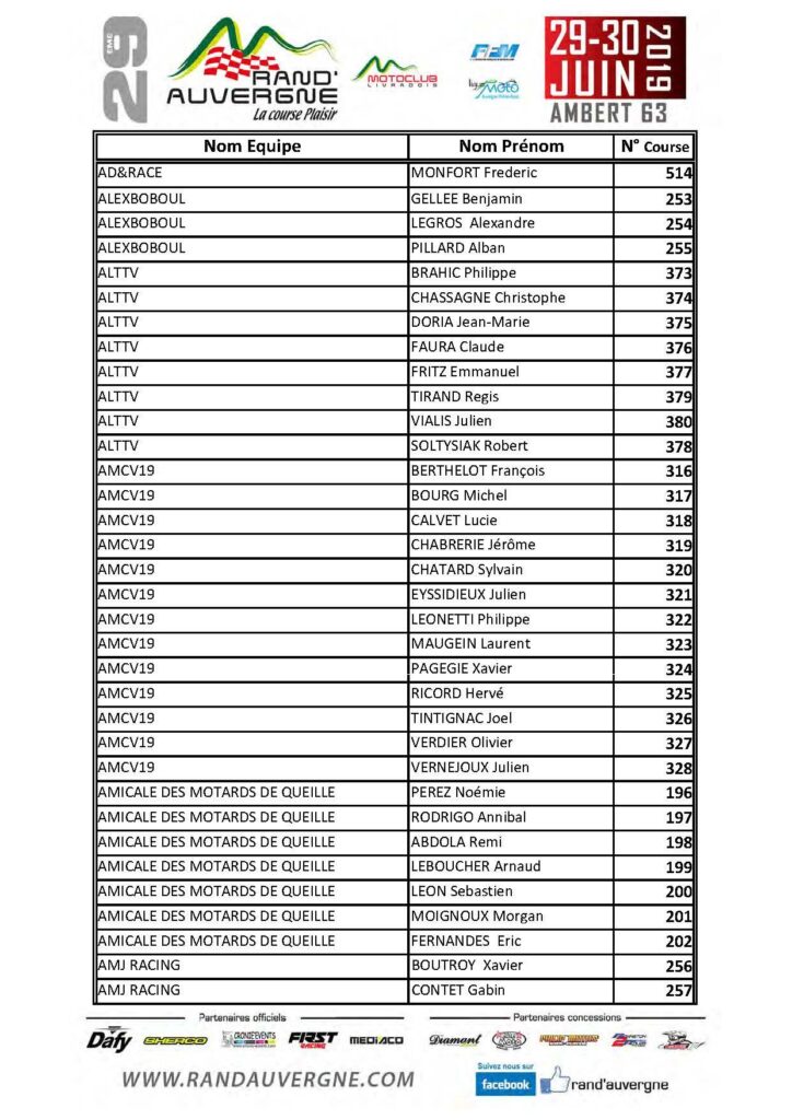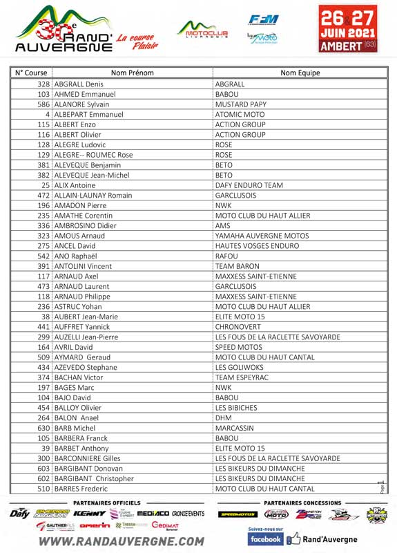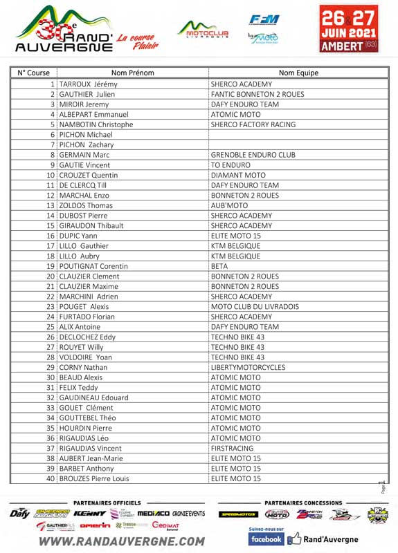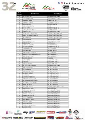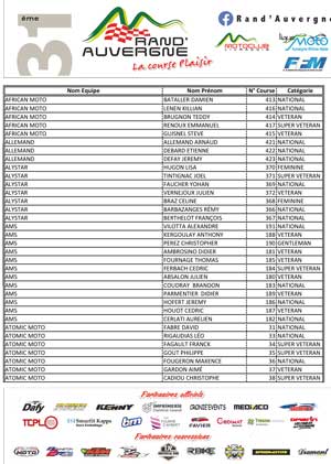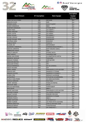 Les pilotes engagés avec N° de course